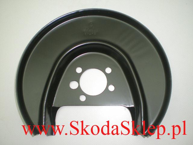 Część oryginalna. Tarcza osłaniająca tarczę hamulcową tylnej osi. Strona prawa (strona pasażera). Występuje w Skodzie Fabia I Fabia II w wersjach z hamulcami tarczowymi tylnej osi.
